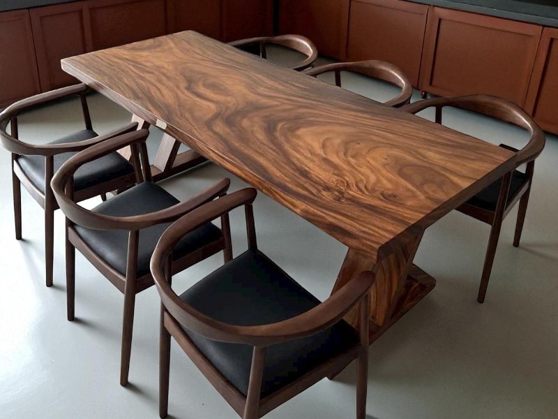 Bàn gỗ me tây nguyên tấm 6 ghế 106x7x212cm