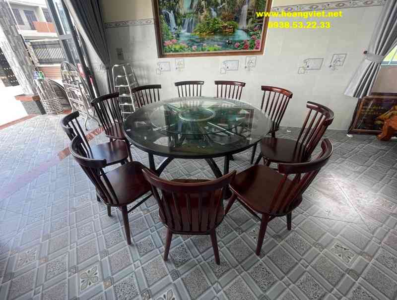 • Bàn tròn xoay mặt kính, khung gỗ căm xe, đường kính mặt bàn 1m5, kính cường lực dày 10mm.