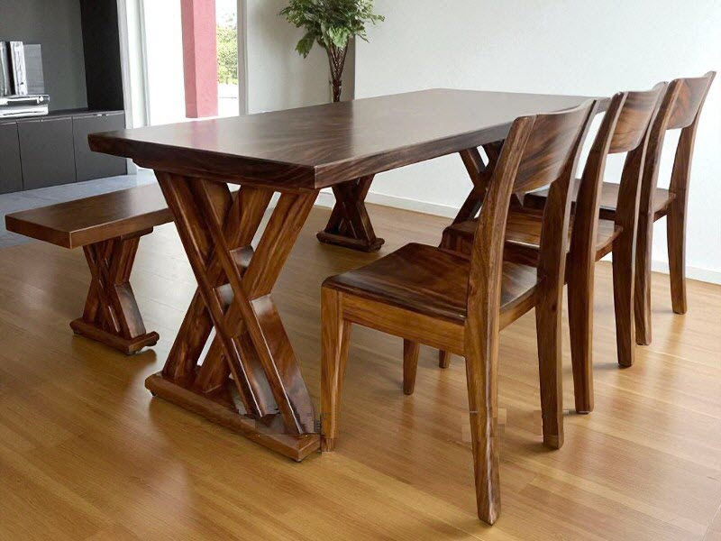 Bàn gỗ me tây 4 ghế KAI 90x5x240cm cao 75cm