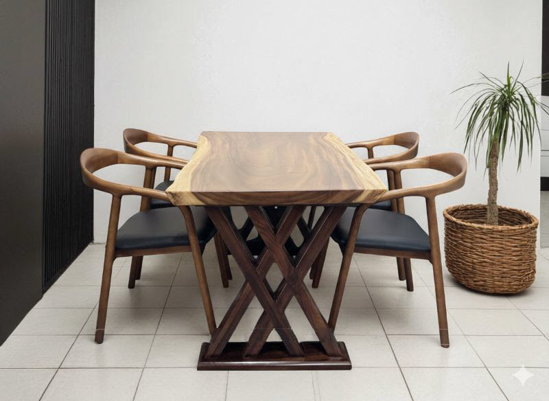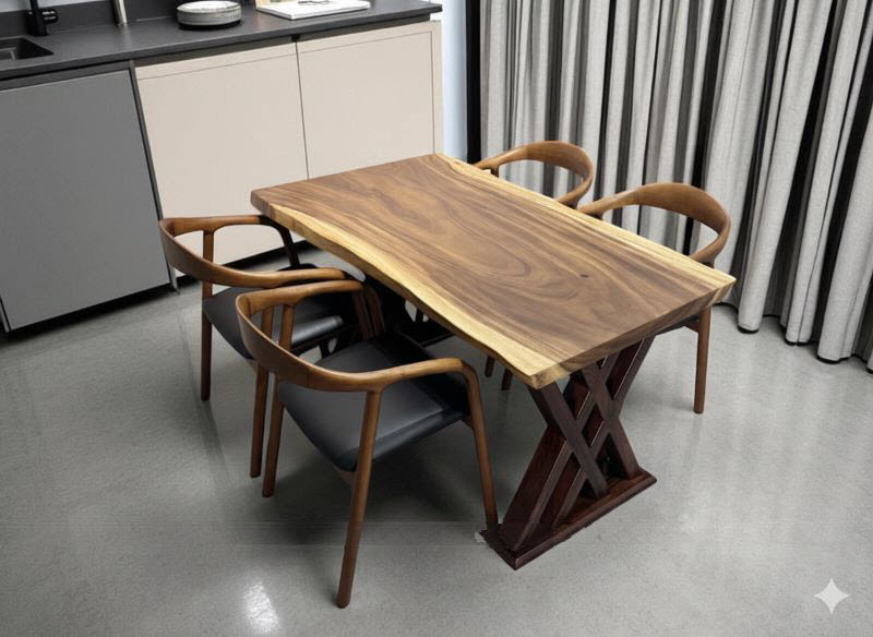 Bàn gỗ me tây 4 ghế KAI 90x5x240cm cao 75cm