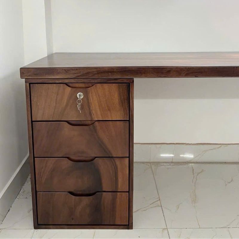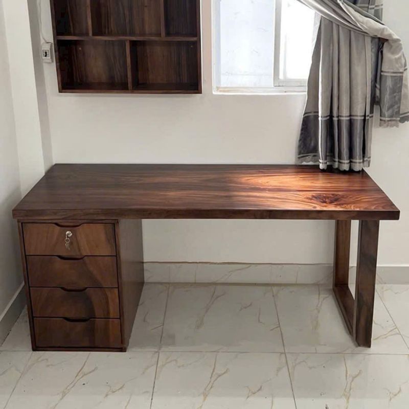 Bàn làm việc có hộc tủ là lựa chọn hoàn hảo dành cho những ai yêu thích sự tinh tế, sang trọng nhưng vẫn đề cao tính tiện dụng. Được chế tác từ gỗ me tây tự nhiên nguyên tấm, sản phẩm mang vẻ đẹp mộc mạc, sang trọng với vân gỗ uốn lượn độc đáo và gam màu nâu ấm áp. Không chỉ đẹp về hình thức còn nổi tiếng với độ bền cao, khả năng chống mối mọt, hạn chế cong vênh, giúp bàn luôn bền đẹp theo thời gian.