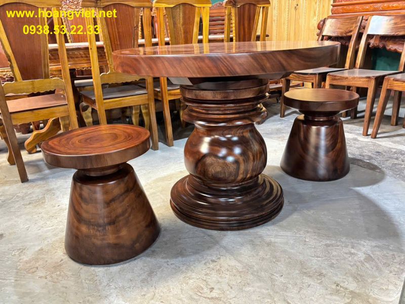 Bàn tròn gỗ me tây 2 ghế đôn là lựa chọn tinh tế cho những không gian nhỏ nhưng vẫn đề cao tính thẩm mỹ và sự tiện dụng. Sản phẩm được chế tác từ gỗ me tây tự nhiên nguyên tấm, nổi bật với hệ vân gỗ uốn lượn mềm mại, màu nâu ấm đặc trưng và độ chắc chắn, mang đến vẻ đẹp mộc mạc nhưng không kém phần sang trọng. Với thiết kế bàn tròn nhỏ gọn, bộ sản phẩm giúp tối ưu diện tích, phù hợp cho căn hộ mini, ban công, phòng trà hoặc quán cà phê phong cách tối giản.