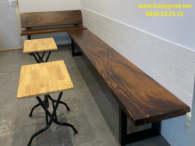 Ghế băng dài gỗ me tây nguyên tấm dùng làm mặt bàn cho quán cà phê.