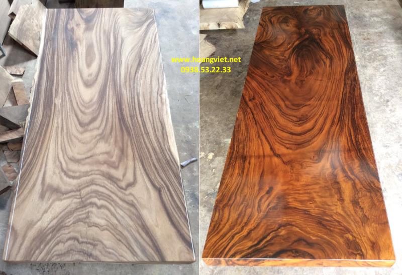 Mặt bàn gỗ me tây còn nguyên mộc và gỗ me tây đã sơn pu với hệ vân cực đẹp.